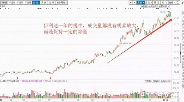 如图所示,伊利股份可谓是2017年典型的白马股之一。股价从年初的16元一路上涨到了35元,但成交量并不是一个持续放量的形态,而是一直维持在一个数量级,并保持了很长的时间。这种量平价升的绩优股值得投资者中长线关注。