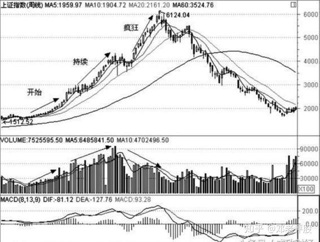 下图是大盘在2006年8月到2008年11月的周K线图。从牛市温和上涨到最后的疯狂,其成交量和价格的配合符合上述特征。