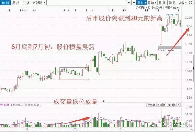 如上图所示的个股招商证券,2017年6月底到7月上旬的交易日中,股价在16.5元到17元附近横盘震荡,而此时成交量已经开始低位逐渐走强。这段时间属于庄家低位吸筹的阶段,后市出现放量阳线拉升,该股进入震荡上行阶段,并于后市突破到20元的新高阶段。这就是较为典型的价平量增案例。