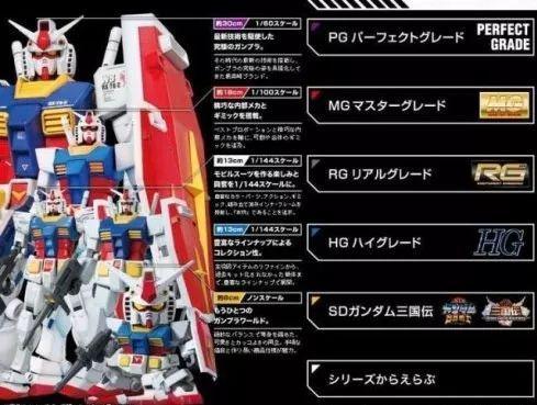 Real Grade,真实级,比例1/144。有人说这是HG的升级版,也有人说这是MG的缩小版,也有鼓吹者说,RG美的完爆PG。客观的说,RG高达拥有一体化的骨架,可动性大幅上升。但是注意这是骨架不是内构骨架,因此如果说在骨架上超越MG和PG还是有难度的。但是RG版本在外甲细节上大幅增强,HG自然就被比下去了。一些老款的MG都不是他们对手。并且配合水贴后简直细节满满,这也是RG一开始被推崇的原因。但是RG的售价真心不便宜,制作难度也不小。但是rg分色水贴都不错,直接做完不上色都有很好的表现力。缺点是骨架很容易松塌。