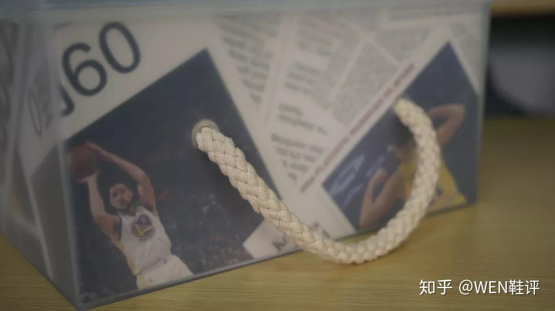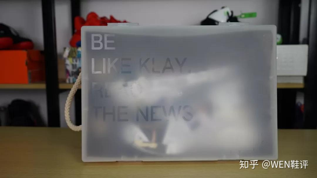 这个盒子上面用金色的字体刻写着“Be Like Klay ,Read The News”。像克莱一样,读一下这些新闻。在鞋盒正面的底部则是克雷的签名,这个鞋盒的四周,是《东湾时报》的片段,底部则是安踏和《东湾时报》联名的一个海报。侧面还有一个拉环,我们可以提着这个盒子。