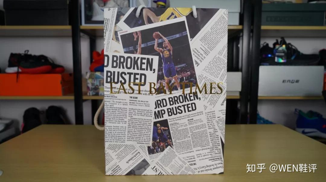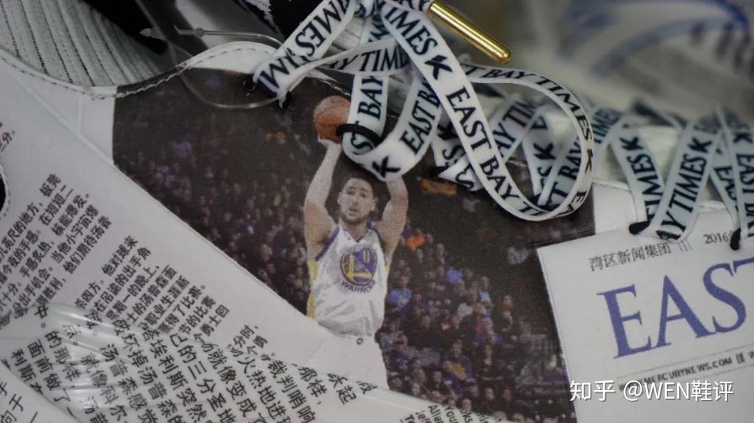 首先是这个袋子对吧,上面就是《东湾时报》历史上有关于克雷-汤普森的报道,有《东湾时报》的原版新闻,也有中文版的,然后分别印有安踏的logo和《东湾时报》的字样,也代表了这次联名的一个存在。