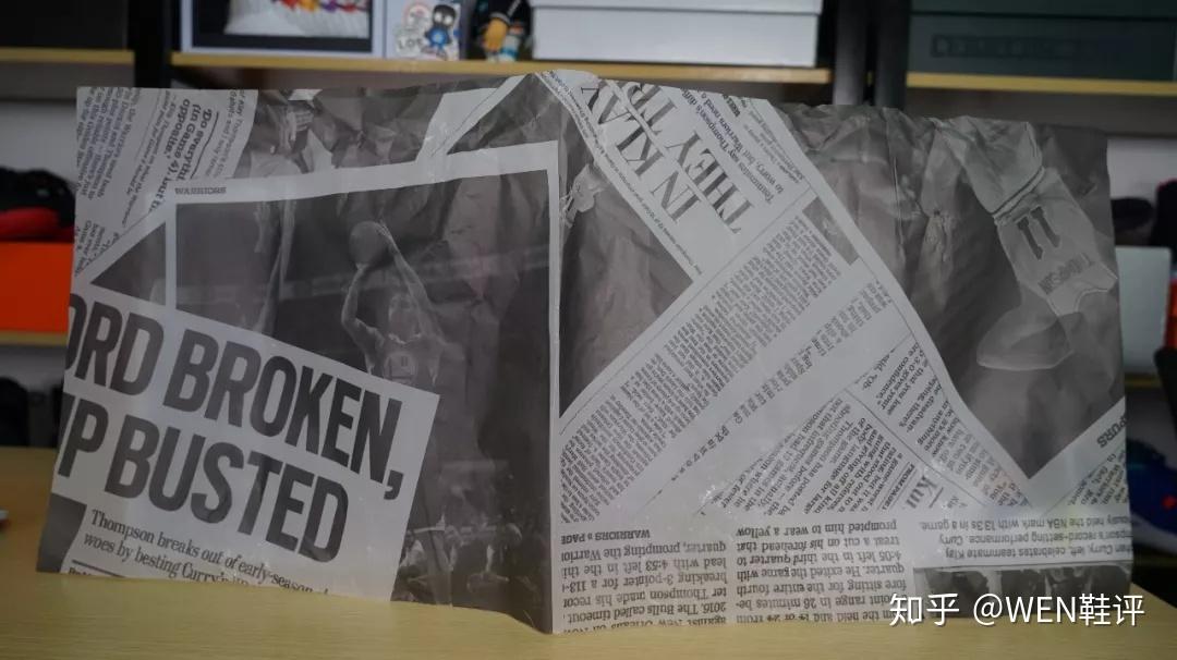 首先这张造型酷似报纸的鞋纸,和刚刚这个袋子一样,上面都是《东湾时报》上之前关于克莱的报道。鞋盒里面内部的鞋纸也是《东湾时报》的片段。