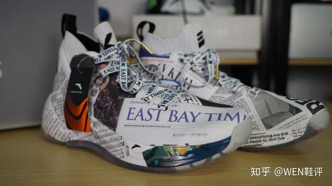 因为克雷-汤普森在比赛之前会有看报纸的习惯,所以安踏就以此为灵感设计了这双球鞋,同时,上赛季是金州勇士队在甲骨文中心的最后一个赛季,下赛季他们将搬到全新的球馆,而汤普森刚好也是《东湾时报》的代言人,所以安踏就和《东湾时报》搞了一个强强联手,推出了这款“报纸”配色的KT4。
