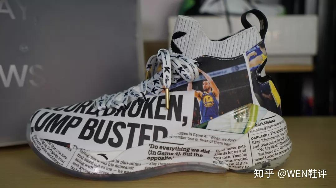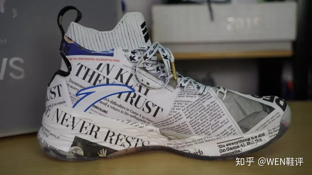 上面也着实都是很正式的报道,以我的经验来看,这应该就是安踏,找到了当时特定的比赛的特定的报纸,用一种特殊的工艺构成的这个鞋面。