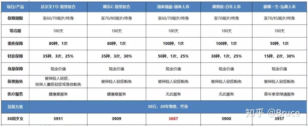30岁女性,30万保额保终身,20年缴费仅需3687元/年,在5款产品中保费最低,对于预算有限的朋友,可以选择这款简单的消费型重疾哦~