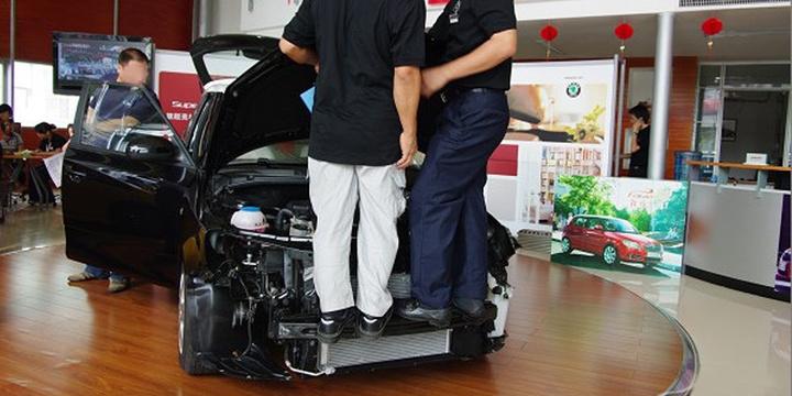 出现在四艾斯店的车辆演示的目的不外乎是告诉你这辆车的某些方面有多好,通常采用的都是电视购物的视觉冲击方法,这种视觉冲击往往又是以歪曲事实为基础的,因为购车者缺乏这种专业知识或者在展厅里被人气带领而形成高度的认同感,比如下面这种情况是想告诉你防撞梁多结实,但你在市面上任何一家五金店随便买一个6毫米的螺栓,都能承受两个胖子的重量,这和汽车碰撞安全没关系。