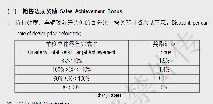 除了这个基础折扣,还有销售达成率等等的奖励,下图是某主流品牌的销售达成奖励政策。