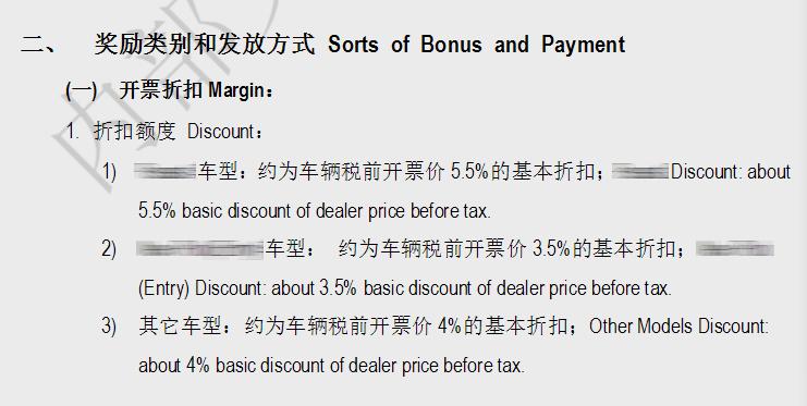另外一种是官方价基础上的比例折扣形式,针对不同的车系,折扣率可能会不一样,下图是另一主流品牌2016年度商务政策给四艾斯店的销售基础折扣。