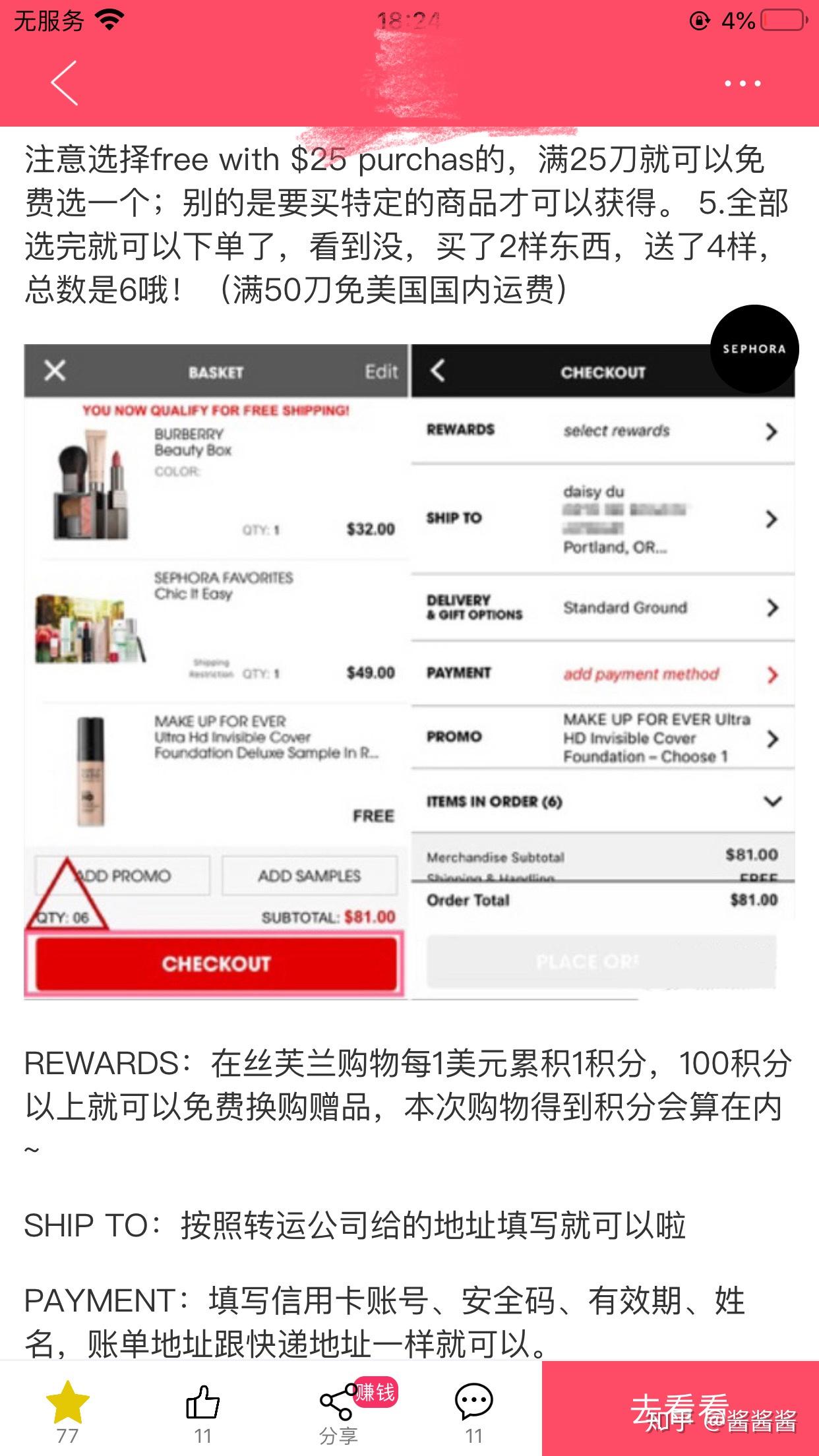 REWARDS:在丝芙兰购物每1美元累积1积分,100积分以上就可以免费换购赠品,本次购物得到积分会算在内~