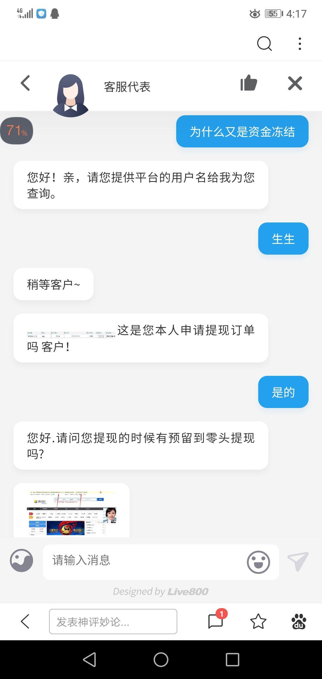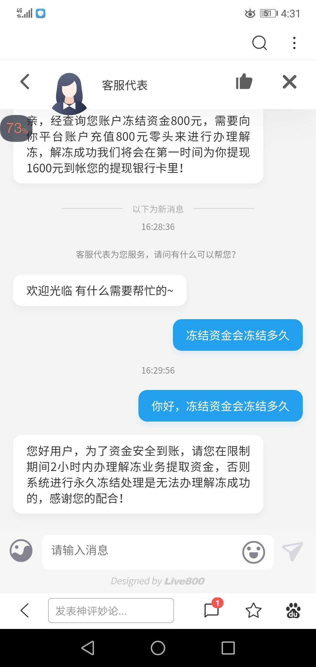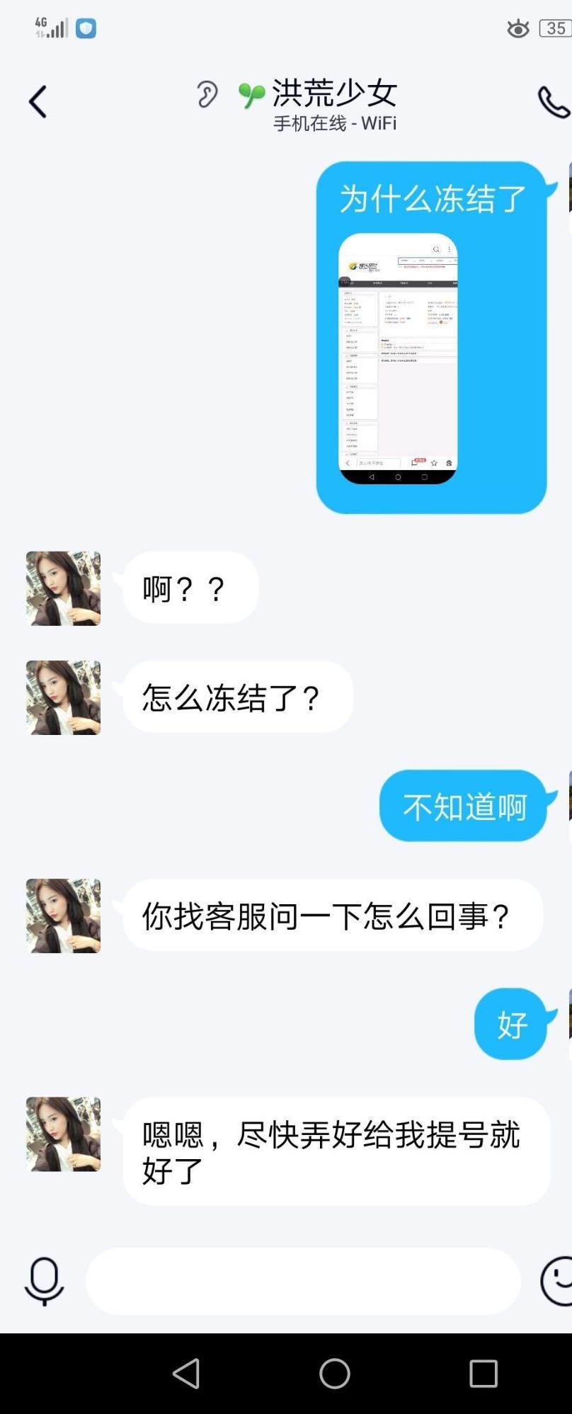这里我有一点愧疚,小妹妹800块钱被冻结了,这可如何是好,无论如何我一定要快点处理好!让客户满意!