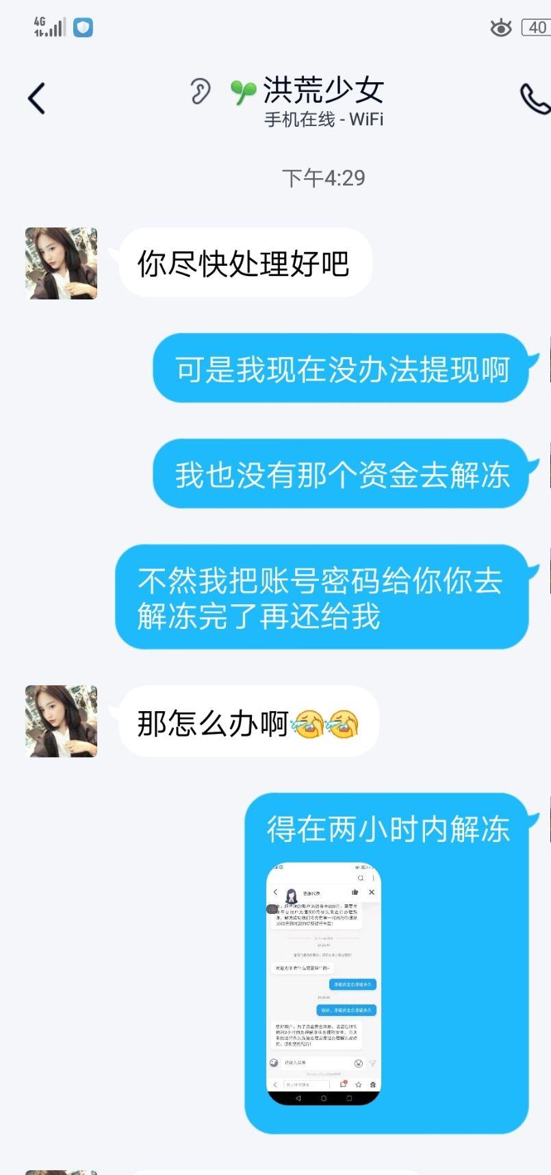 到这一步我心里有愧疚,但是没有心疼,反正这800在我心里不属于我,只是一个数字,毕竟我还没收到钱,大不了不解冻了钱不要了直接把号给她也没什么(这是我想出来的最安全的办法)