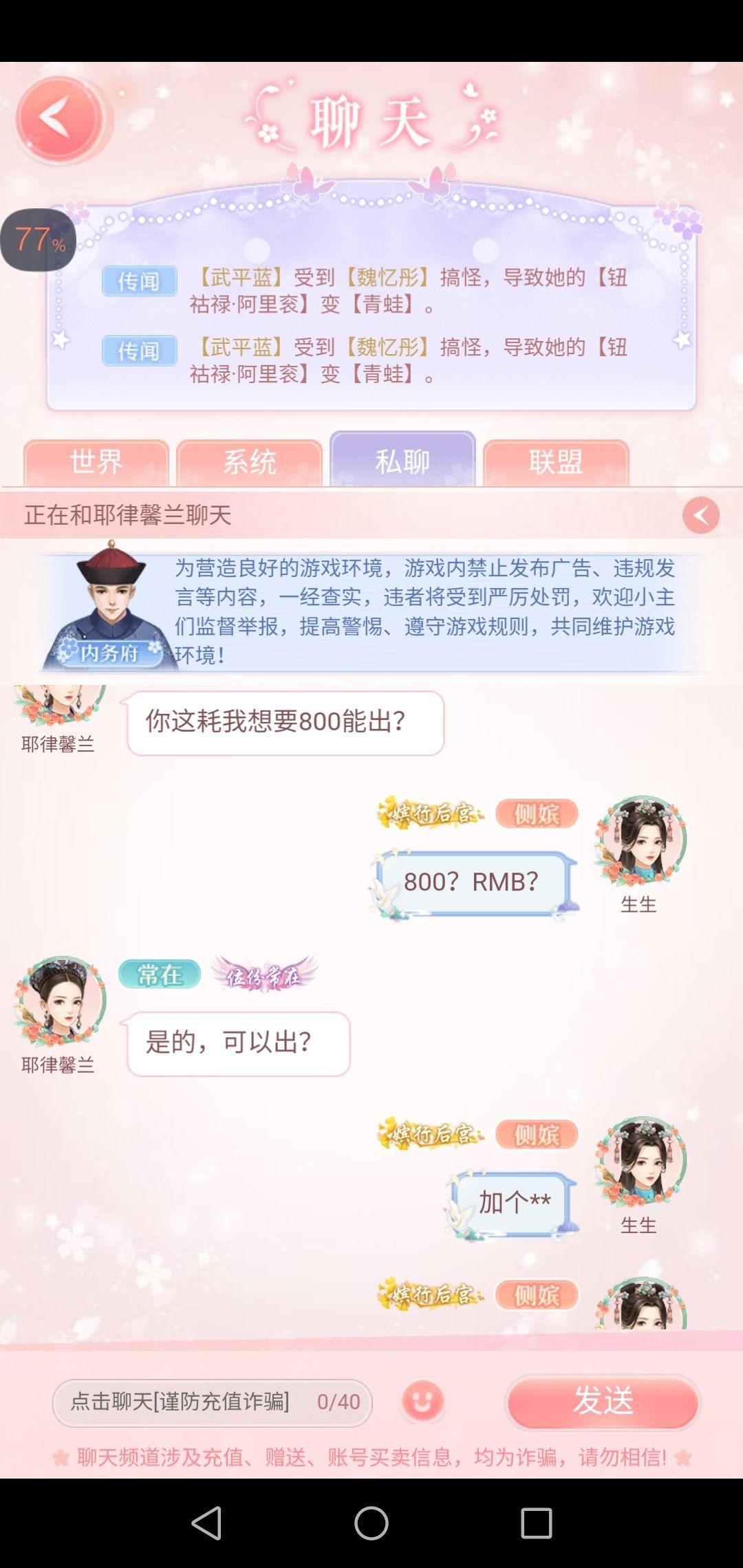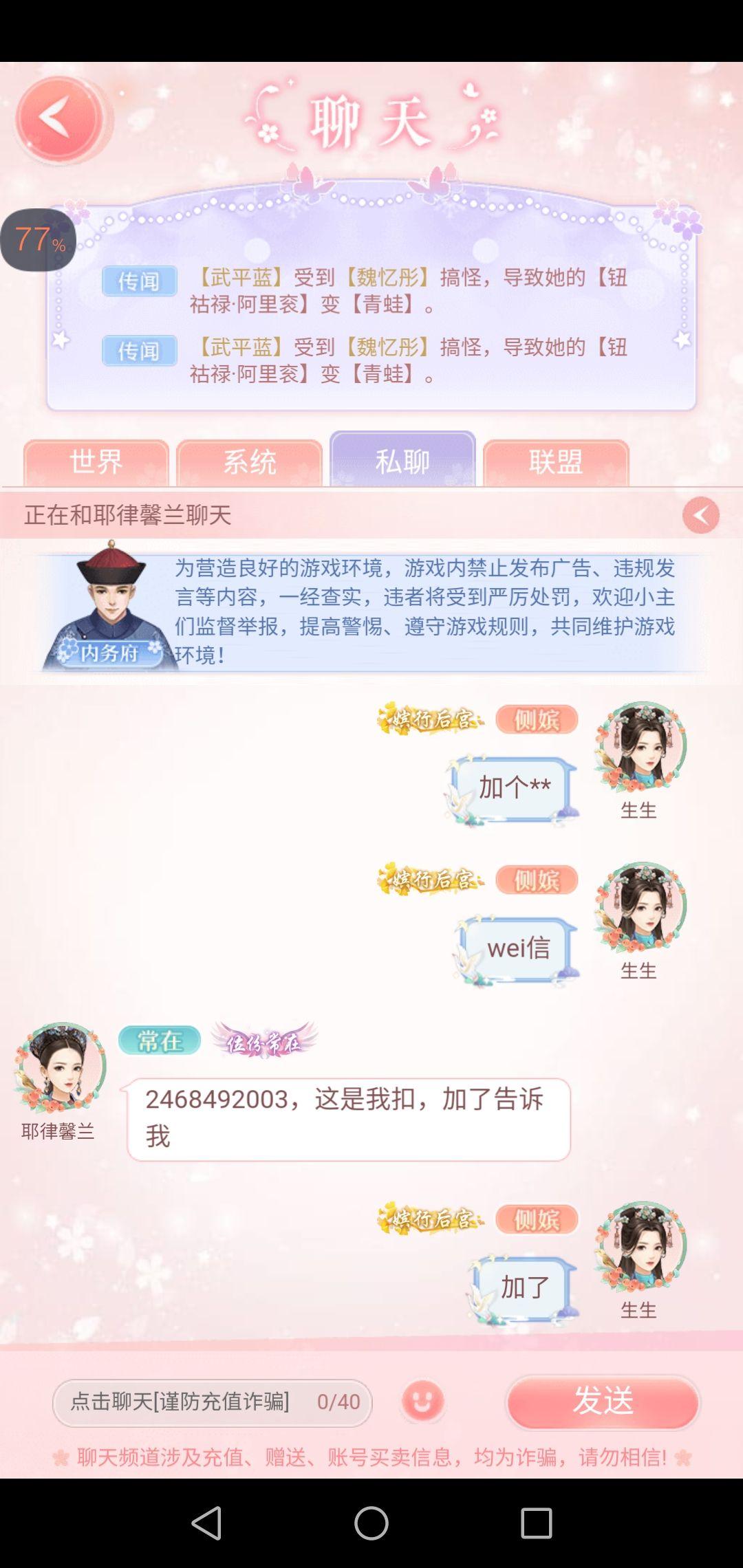 是这样的,我在玩一款游戏叫后宫宛如传,下午我上了号照常刷经验领金币就盼着通关升级称霸后宫,介绍一下背景,我是一个很抠门很抠门的人,抠到某者荣耀游戏我玩了两年只充了一块钱买阿珂的什么风华皮肤,所以这个游戏我是完完全全没有充过一分钱靠自己的辛苦耕耘通关升级的,然后!我就看到好友那有个小红点,然后就通过了那条好友申请(平时上号经常有人来加我,我强迫症看不惯那里有个小红点加上她们都是一些小透明加好友从来没有私聊过所以一律同意),接着,我和这位耶律馨兰的故事开始了