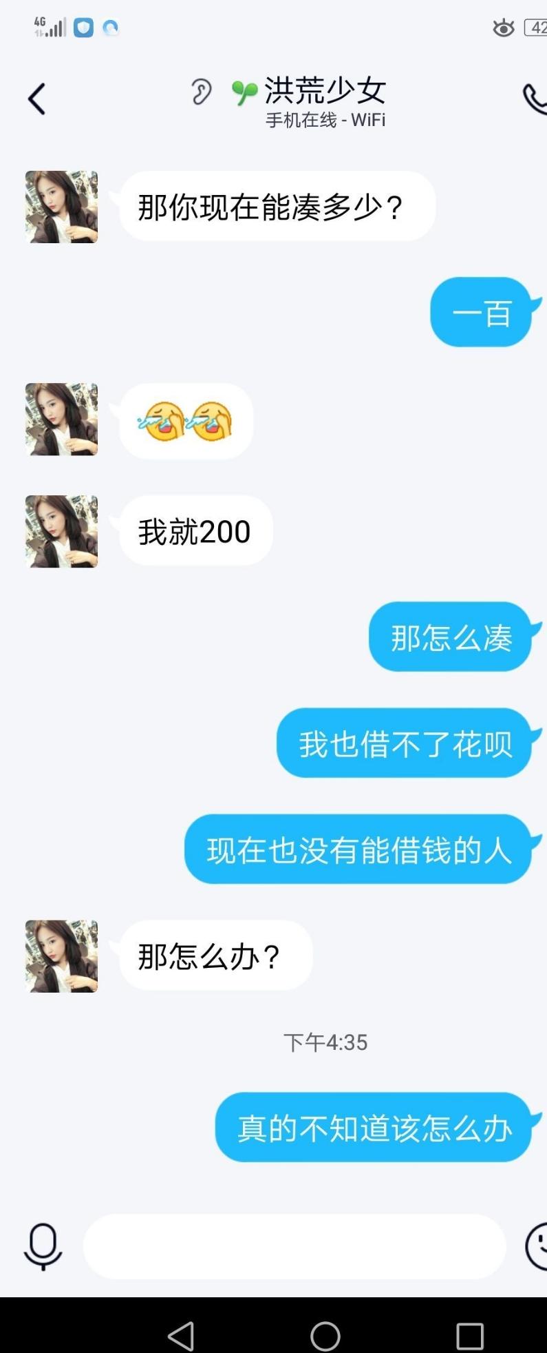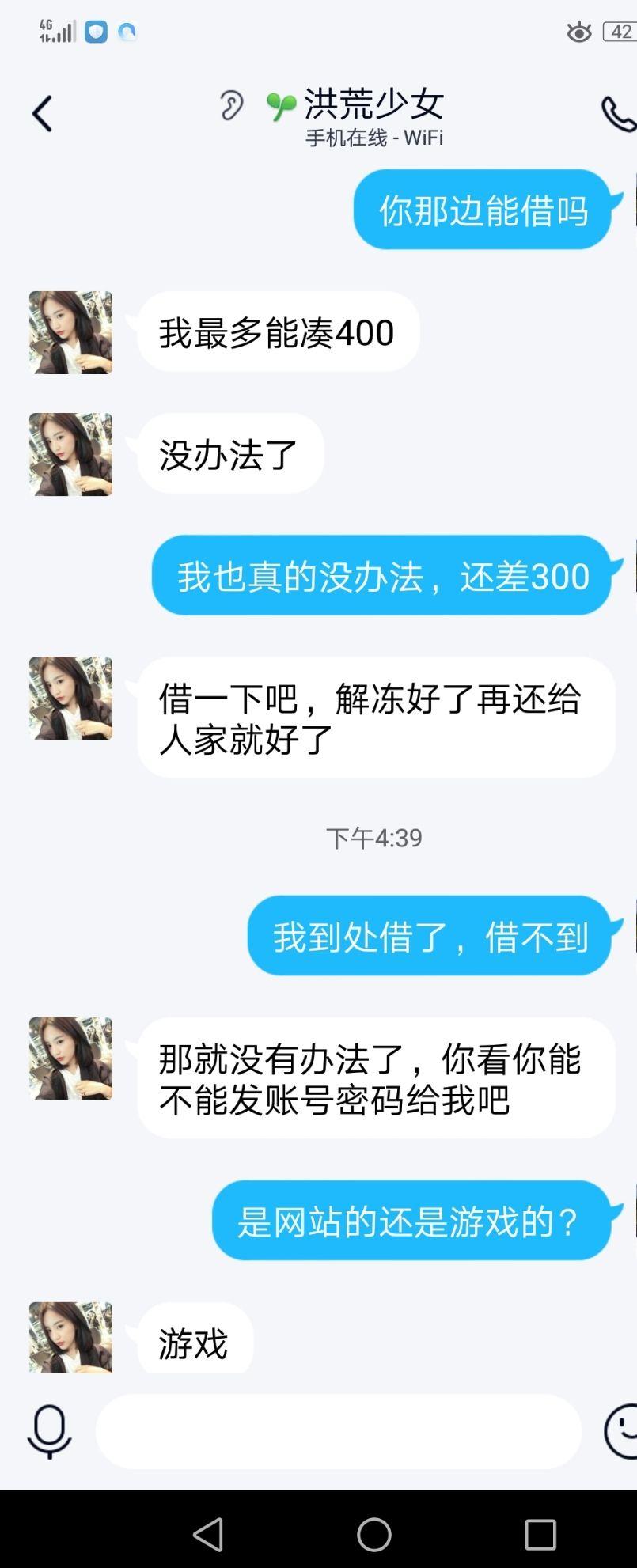 我骗她了,要是被我朋友知道我为了网上交易借钱那我以后还怎么在她们面前称王称霸,怎么抬得起头(毕竟前几天有个同学要加入微商跟我们另一个同学借钱,另一个同学跟我说我告诉她别借给她这是骗局)现在要我去借那我的脸岂不是打肿?
