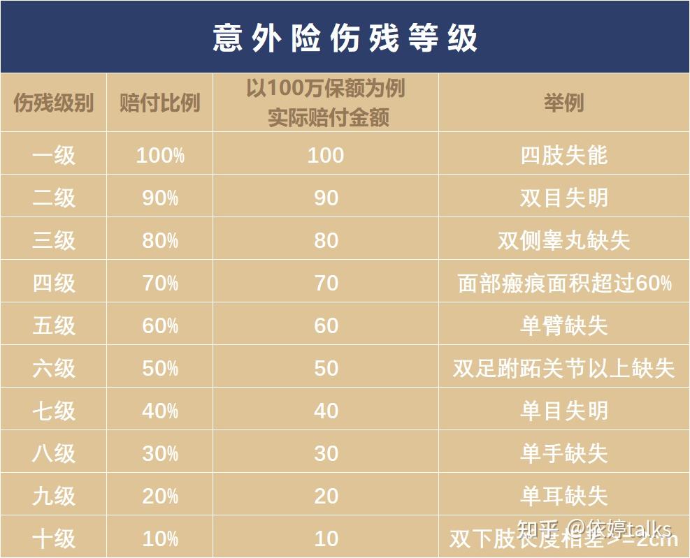 意外伤残,分十个等级,每个级别赔付不同比例保额。一级赔付100%保额,二级赔付90%保额,三级赔付80%保额......以此类推,十级伤残赔付10%保额。有些产品只赔付全残,即一级伤残,请避坑!即使它附加了其他有的没的花里胡哨的责任,也掩盖不了这个产品的缺陷。我们要懂得抓大放小。意外医疗,不管是门诊还是住院,都可以报销。此处有个注意事项,意外医疗责任这块一定要放大双眼看看有没有保障社保目录外用药,如果没有,那就拜拜,直接找下一个产品可以保障社保目录外用药的。我们在挑选意外险的时候,除了意外身故、伤残责任,最好有意外医疗责任,且可以报销社保目录外用药。3、适合投保人群大人、小孩、老人都需要。意外无处不在,每个人都有可能面临意外。对普通老百姓来说,挑选一份综合意外险即可。