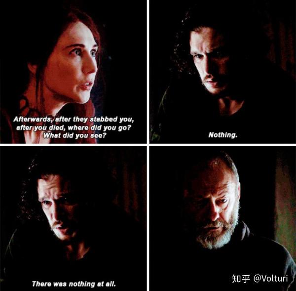 权力的游戏里,当死去的囧雪诺复活,面对红女巫“当你死去,你在那边(地狱,冥间)看到了什么?”的问题,囧雪这么回答: