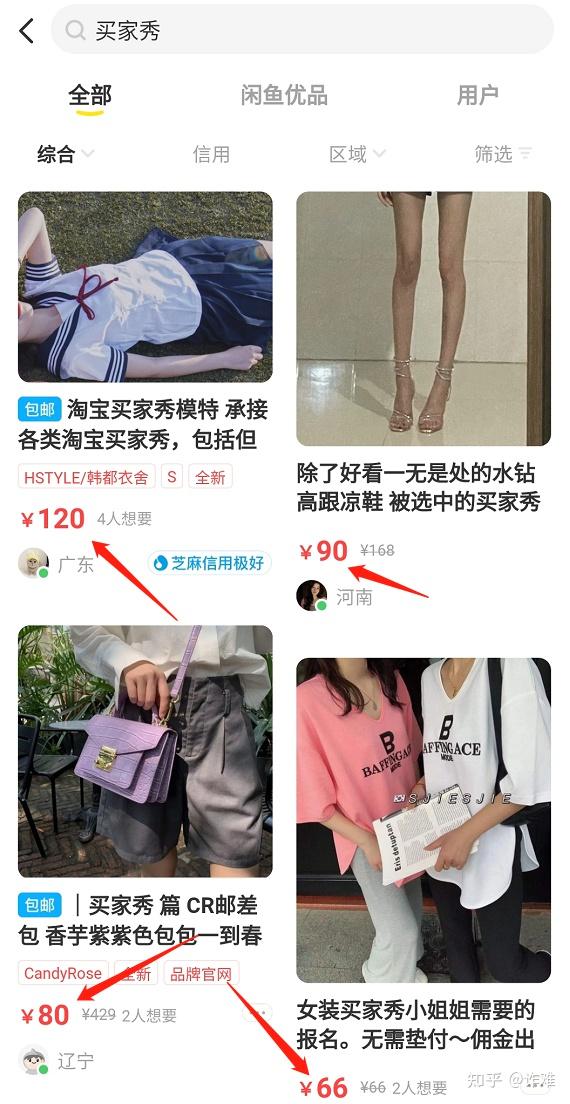 闲鱼搜索“买家秀”,标价基本上就是成交价格,相对于其他平台来说流量偏少。