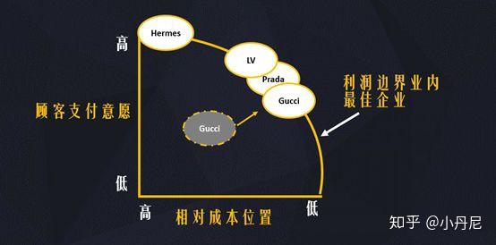 如果看当时的利润边界,Gucci基本处于爱马仕的地位——相对成本位置与顾客支付意愿同样高: