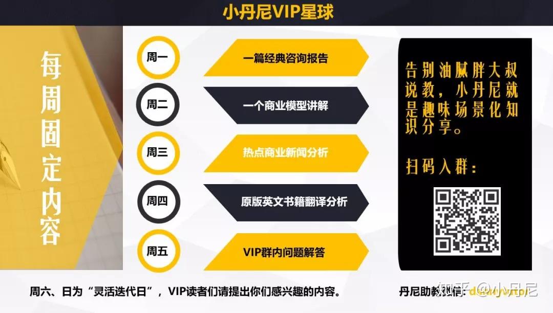 小丹尼将继续坚持提供有价值的内容,并用“告别油腻胖大叔说教,趣味场景化的知识分享”方式继续为大家服务(想想你们是如何学习知识的,是靠死记硬背还是不同场景),我们建立了小丹尼VIP星球,每周分享VIP专属内容(群内已上传价值149元的付费报告,还不包括未来一年的内容服务)、VIP群内问题解答(每日早起打卡+思考一个问题)等等。