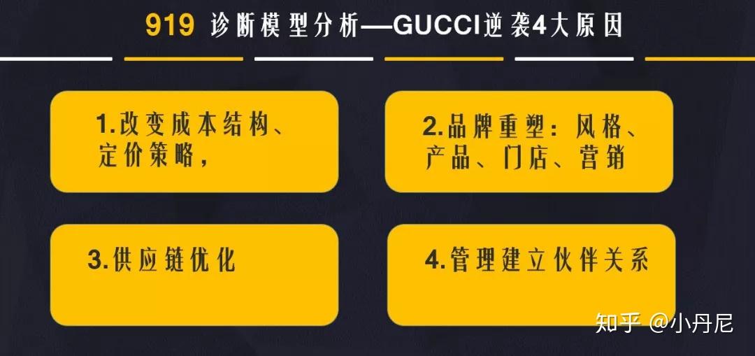 根据我们的919诊断模型分析,Gucci从1到9的过程,有四大成功要素: