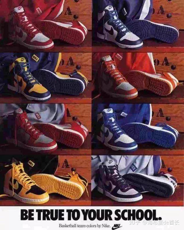 聊聊SB Dunk吧。我知道很多人习惯性的把Dunk和SB Dunk混为一谈。但其实,前者是后者的老大哥。早在80年代,Dunk就曾与Air Jordan并驾齐驱,作为Nike篮球鞋的主力军出现在世人面前。得益于美国大学联赛的繁荣,Nike公司为 Dunk 设计了Be True to Your School系列球鞋,并顺势向各所赞助的大学推出。