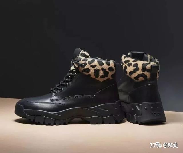 比如这一双,外形和传统登山鞋很像,不过鞋型更有线条感,黑色搭配豹纹装饰看着更有个性。