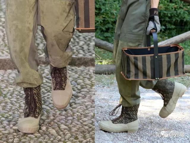 范主还注意到Fendi出了这双橡胶靴,采用拼接材质,猛一看有点看像雨靴,近看才发现有着老花装饰,细节很多。