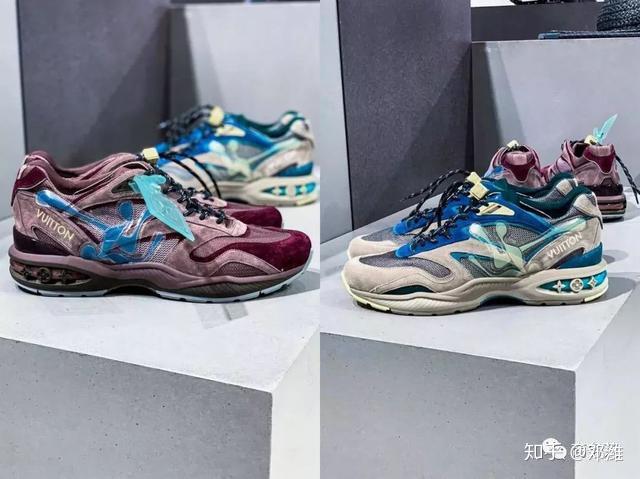 整体轮廓呈流线型,鞋面采用麂皮和棉网拼接材质,鞋面还有个类似Off-White的PVC防盗扣装饰,上面印着LV字样。
