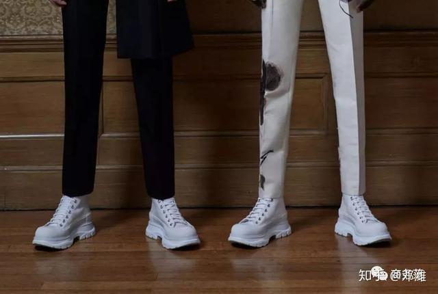 麦昆新系列中,模特穿的运动鞋也蛮工装风的,有点像和厚底登山鞋的结合。看模特演绎休闲装、西装都能搭。