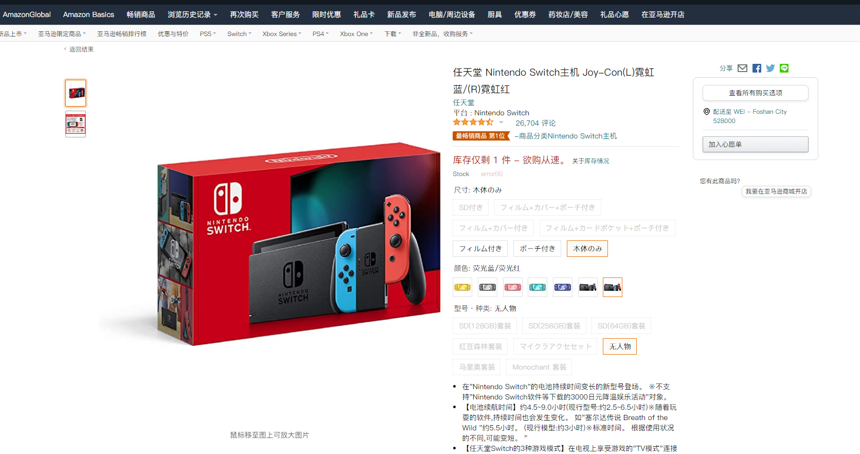 这种购买方式,一般是在确实没货,并且黄牛加价1000其右的时候使用(毕竟算上转运+关税也才比原价贵出来600左右)另外就是官网购买的话,支持对joy-con颜色进行定制,这也是市售机器做不到的。