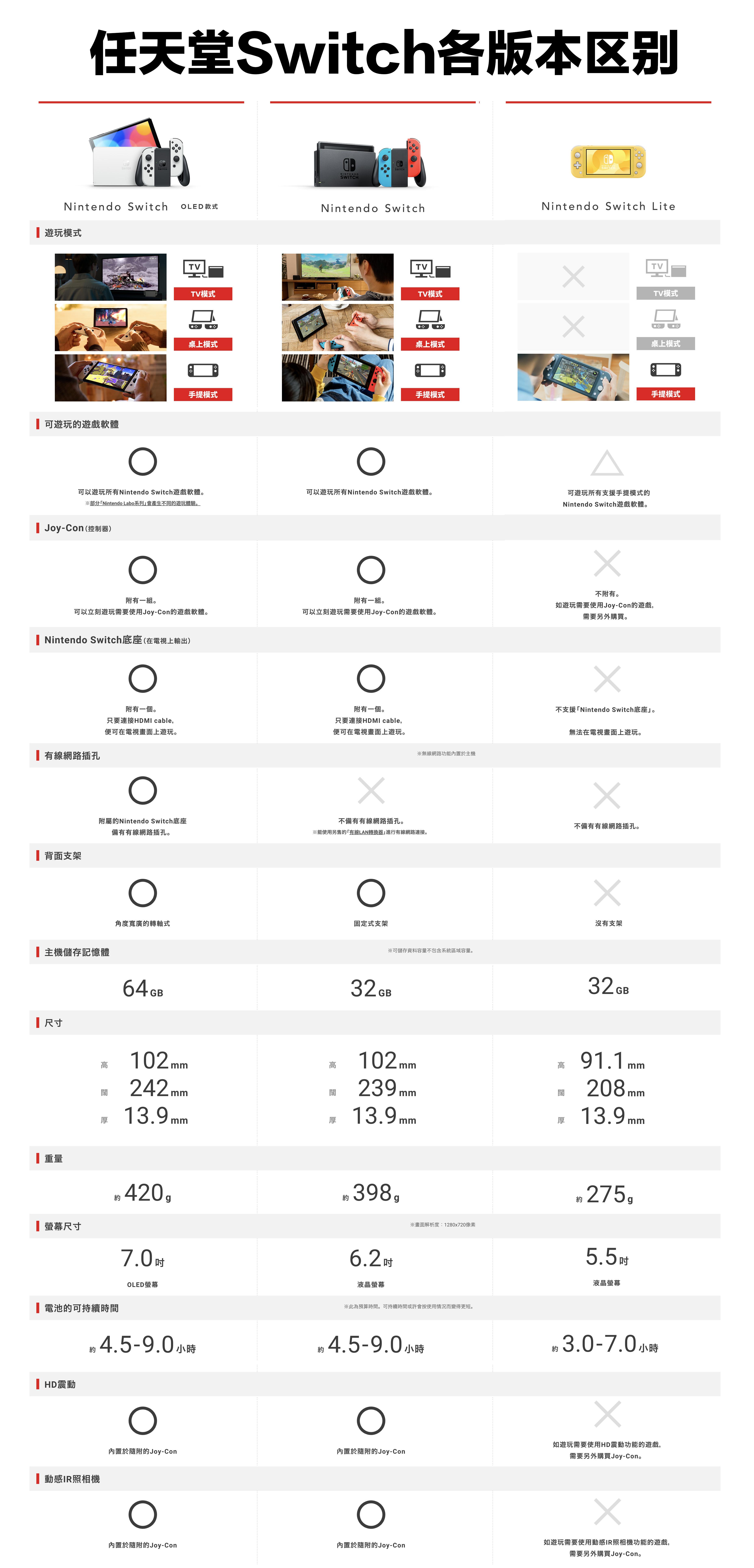 到目前为止,Switch 一共有4个型号(包括10月8号即将发售的 Switch OLED),我们先来看一张图片(可点击放大):