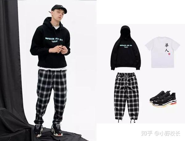 字母卫衣+T恤+格纹束脚裤+老爹鞋