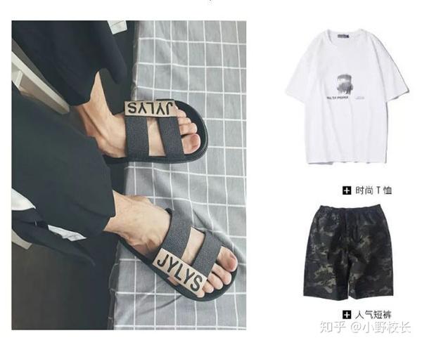 印花T恤+迷彩短裤+沙滩鞋,鞋面大多为绑带镂空