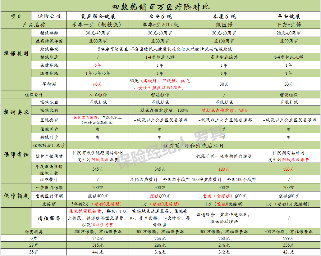 作为百万医疗,难免逃不开要和下面3款最具竞争力产品进行比较,详见下图: