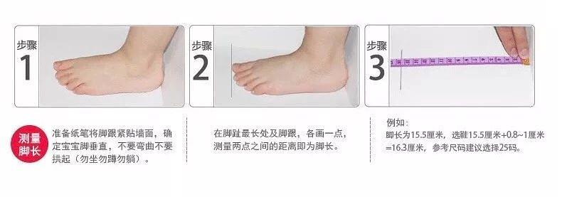比较推荐下午傍晚时候测量小脚丫,下午脚会比上午脚大一点,让宝宝光脚站立在一张白纸上,脚趾不能弯曲,拿只笔记录下脚趾最高点,和脚后跟最高点,然后拿尺子量下这两点的距离。