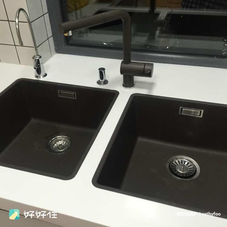 花岗岩单槽x2,比双槽更好用的双单槽!右槽安装了垃圾处理器,没有湿垃圾的走左槽。台中盆,安装考验工人手艺,使用下来很好!