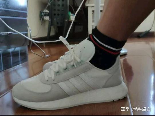 我自己也入手了一款,在搭配起来也是比较好看的,比较简洁,基础款,搭载了boost的中底,在走路和跑步上有着本有的软弹,(吐槽一下,为什么没有鞋垫呢)
