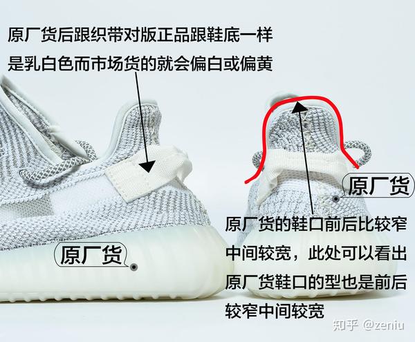 2.鞋口:正品是比较直而且比较有型的,上下部分偏小,中间偏宽一些,而fake则是前后一样窄的比较均匀。鞋后跟的织带:real是乳白色,fake要么偏白要么偏黄。