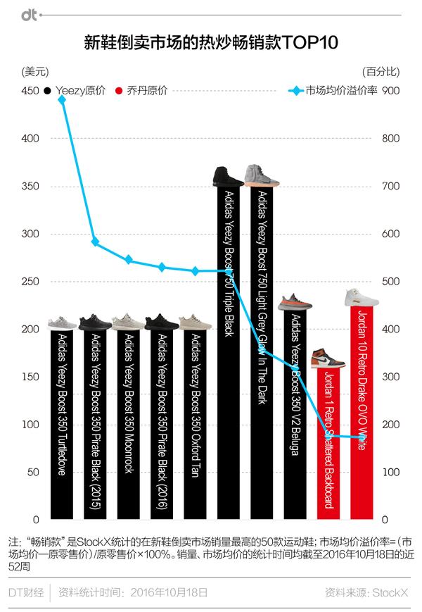 上榜的两款乔丹鞋,在新鞋倒卖市场的均价都是原价近两倍——这个成绩看起来已经很不错了,然而Yeezy系列的市场溢价率最低也在300%以上,最高接近900%!
