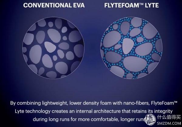 于是,在新的旗舰款跑鞋Gel-Kayano 25上,FlyteFoam中底得到了进一步的细分升级,Gel-Kayano 25的中底上层搭载了Flytefoam Propel材料,而下层则是Flytefoam Lyte材料。其中,Flytefoam Lyte可以看成是FlyteFoam材料的升级款,由纳米纤维和低密度轻量泡棉混合而成,而且相比Flytefoam更加轻量。(下图是在显微镜下的传统EVA和Flytefoam Lyte的区别)