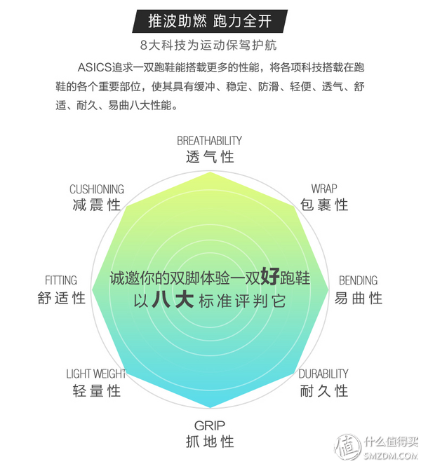 ASICS的最高标准必须满足减震、抓地、透气性、灵活性、轻量化、耐久性、稳定性、包裹性八大基本性能,只有这些性能都达到了最佳水准,才有资格获得IGS标志(ASICS 专利缓冲吸震系统)也就是我们常说的顶级跑鞋的概念。
