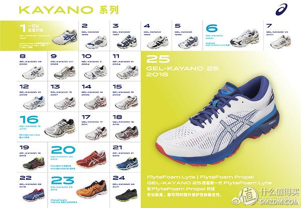 从1993年的初代Gel-Kayano Trianer开始,Gel-Kayano系列就一直伴随着鲜花和掌声,如今已经到了第25代。从下面这个图中也可以看出Gel-Kayano的进化路程——Gel-Kayano 16首次使用了Guidance Line技术、Kayano 20升级到了Fluidfit鞋面和Fluidride双层中底、Kayano 23引入了Flytefoam,到了Kayano 25的时候,升级为FlyteFoam Propel和FlyteFoam Lyte的组合。