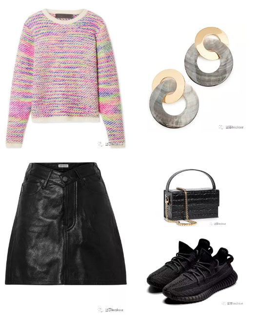 如何搭?小蜜推荐搭配:毛衣+皮裙+小方包+耳环+Yeezy 350鞋
