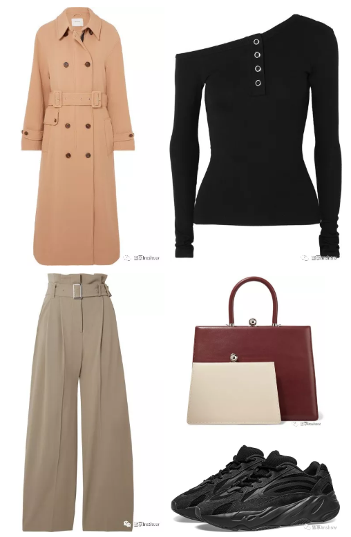 小蜜推荐搭配:风衣+露肩上衣+子母包+阔腿裤+Yeezy鞋