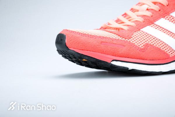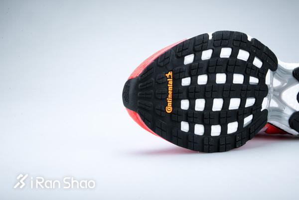 adizero adios Boost 3的大底有两种材料组成,前掌是我们熟知的Continental马牌橡胶,设计上一改上一代的大底防滑设计,这一代网状块状的设计相比于之前更加坚硬耐磨防滑。