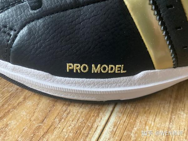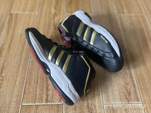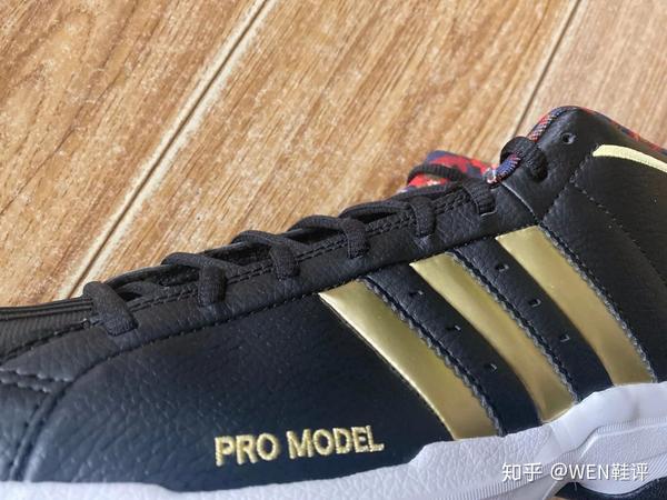 鞋面上金色刺绣上的“Pro Model”字样,已经阿迪标志性的logo可以说是这个配色最大的亮点了。黑金配色给人的感觉一般就是霸气嘛。