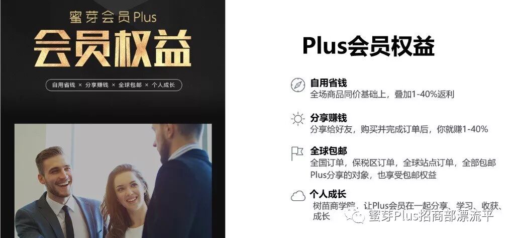 加入蜜芽plus以后,自己在平台上买生活用品,家居用品,衣服,鞋子包包,护肤品等等,都是可以享受平台给的1%-40%的佣金返利,分享给别人买的话,平台也是给到你相应的一个佣金提成,也就是说自用是省钱,分享给别人是可以赚钱的,大家是互惠互利的。